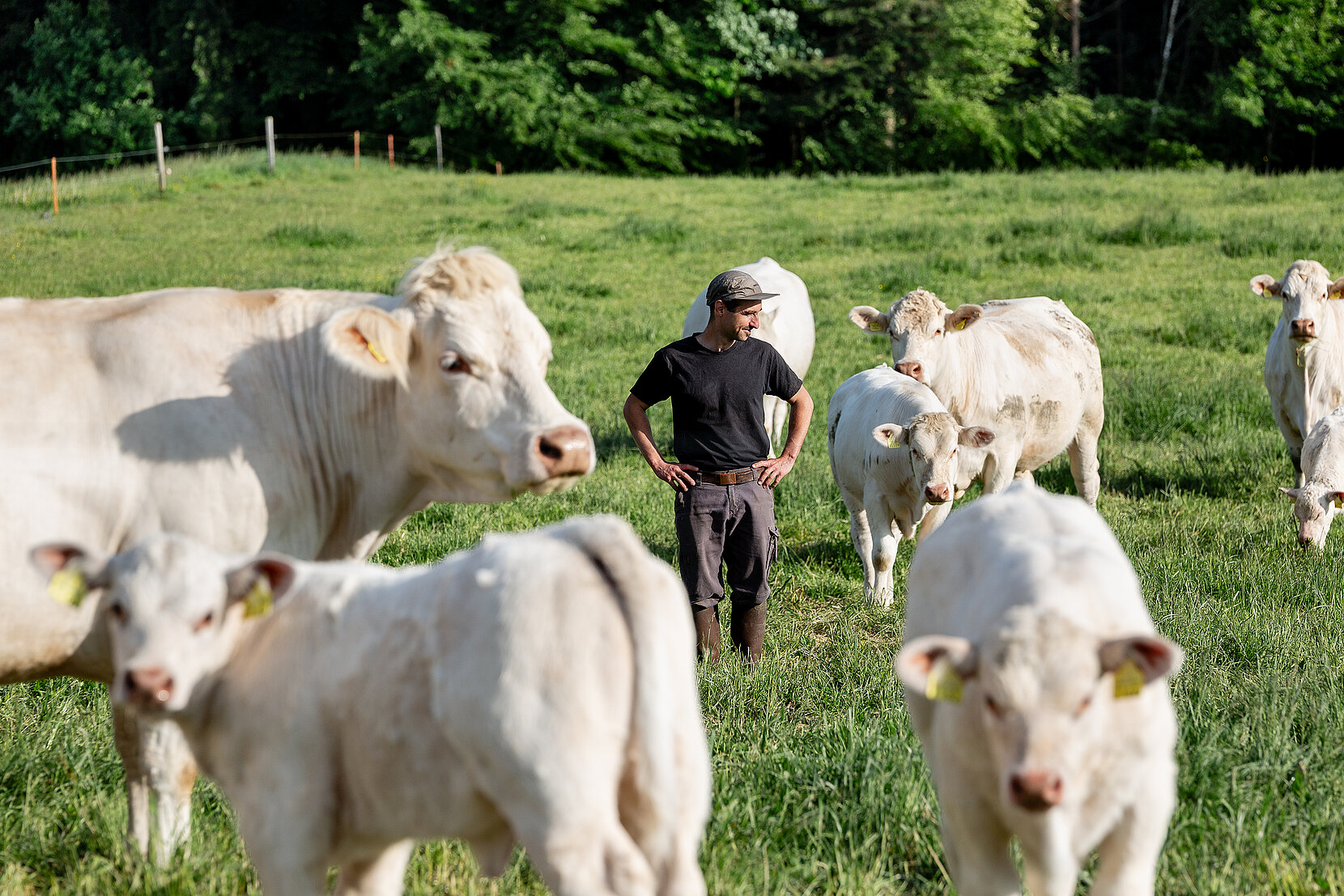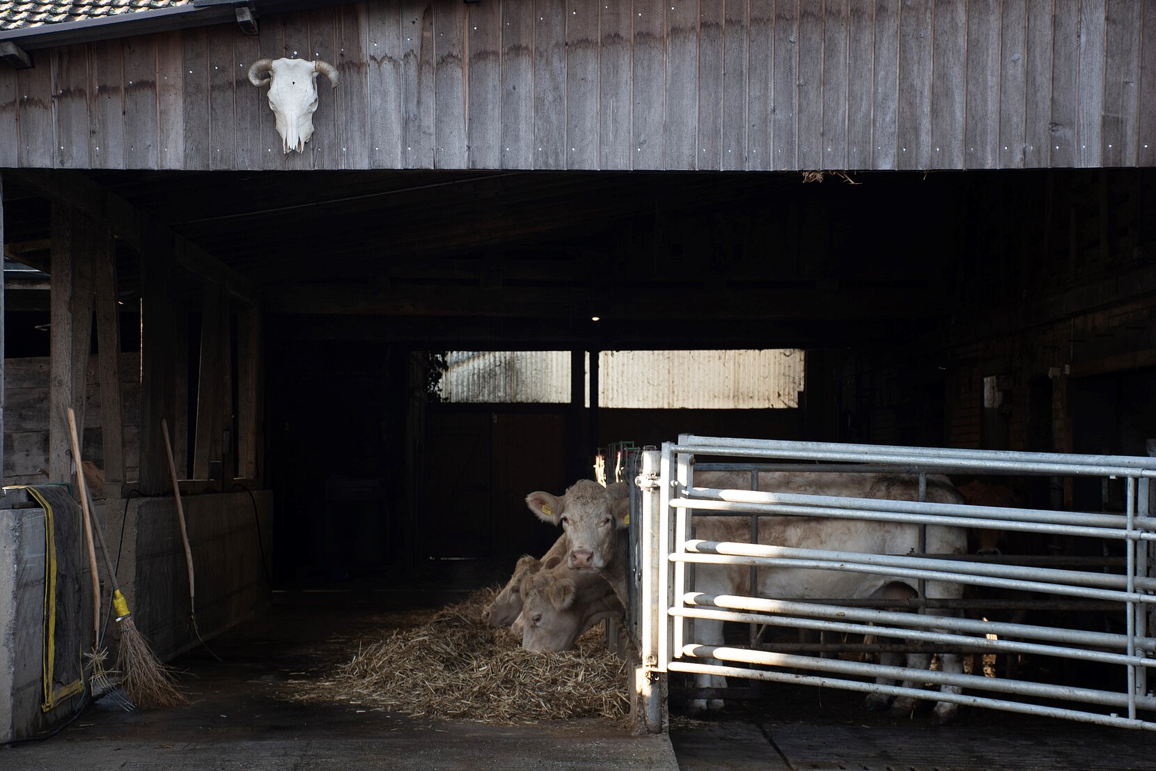 Der Hof umfasst 35 Hektaren und wird seit Jahrzehnten biologisch geführt. Im Mittelpunkt: eine Mutterkuhherde, 45 Tiere sind es. Insgesamt leben 140 Stück Rindvieh hier: Die grossen, weissen Rinder der Rasse Charolais stammen ursprünglich aus dem Burgund und finden sich mit den Bedingungen des Mittellandes perfekt zurecht. Auch die Aubrac-Rinder stammen aus Frankreich und gelten ‒ in Sachen Fleischqualität ‒ als Geheimtipp. Kälblein werden keine geschlachtet. Die Rinder dann fressen viel Gras und nur wenig Mais aus eigenem Anbau. Im Sommer zügelt die Herde auf eine Alp im Jura, währenddessen kann der Bauer Futter für den Winter einfahren.