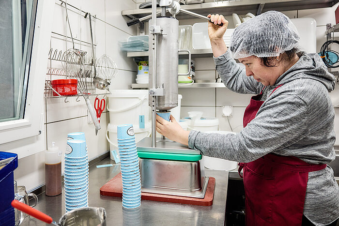 Mitarbeiterin Nataliia Ivanenko füllt das Eis ab.