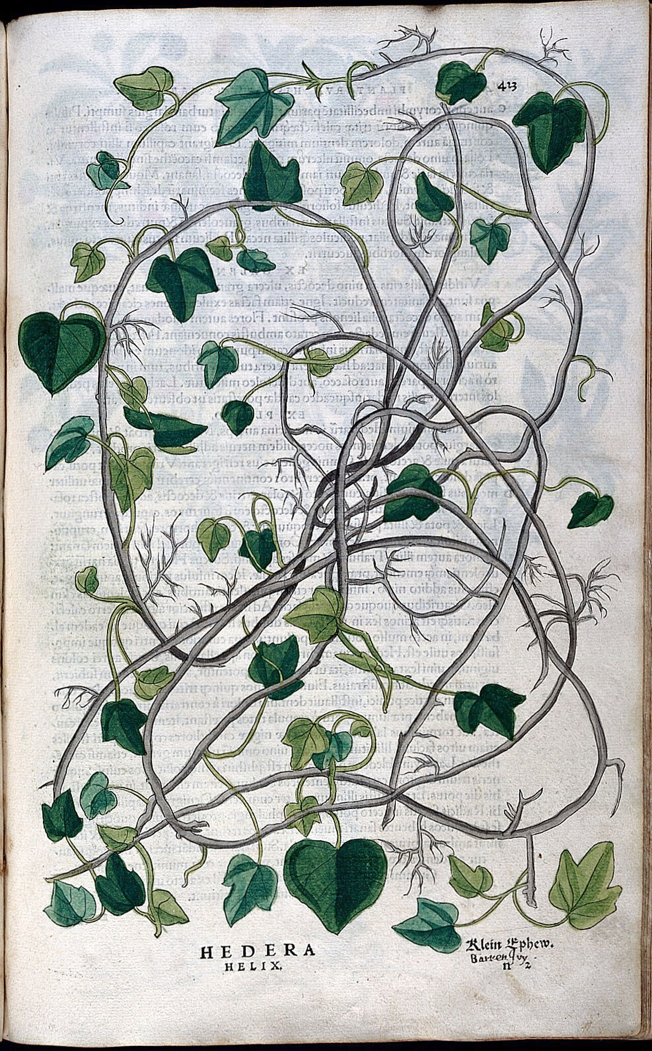Kürzlich bin ich über ein sehr schönes Bild von Efeu gestolpert (meine Wortwahl wird von meinem Rasen beeinflusst, fürchte ich). Ein sehr altes Bild, es stammt aus dem wohl ersten botanischen Bestseller von 1542 namens De historia stirpium oder aus der darauffolgenden deutschen Version New Kreüterbuch. Geschrieben und illustriert vom Arzt und Botaniker Leonhart Fuchs (1501–1566). Die erweiterte Fassung ist in der Österreichischen Nationalbibliothek in Wien zu sehen.