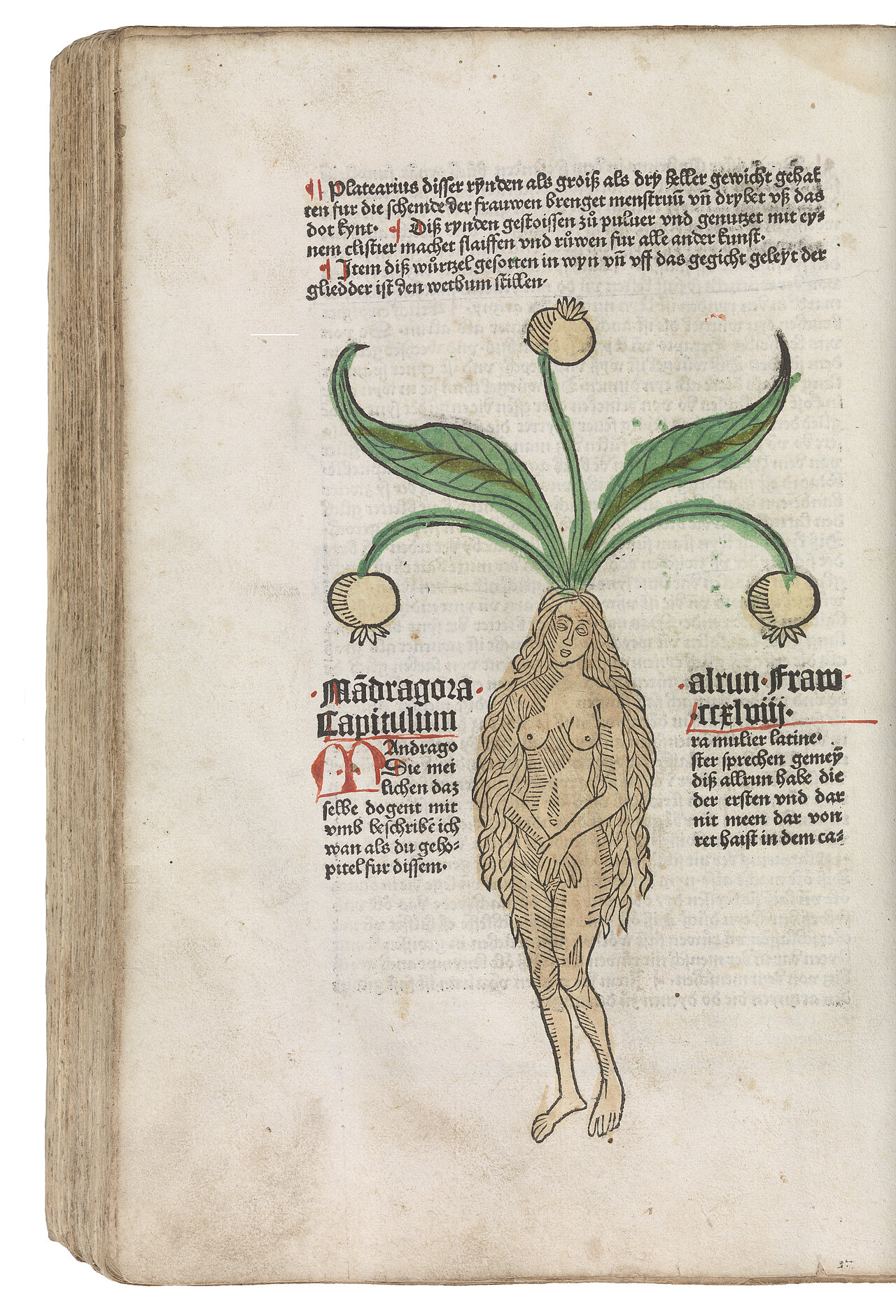 Im Buch finden sich neben vielen Zeichnungen, von denen die meisten tätowierenswert sind, skurrile Dinge, mit denen ich mich noch weiter beschäftigen will. Etwa mit der Alraune, deren Wurzeln oft in Menschengestalt illustriert worden sind, folgende im Jahr 1485.
