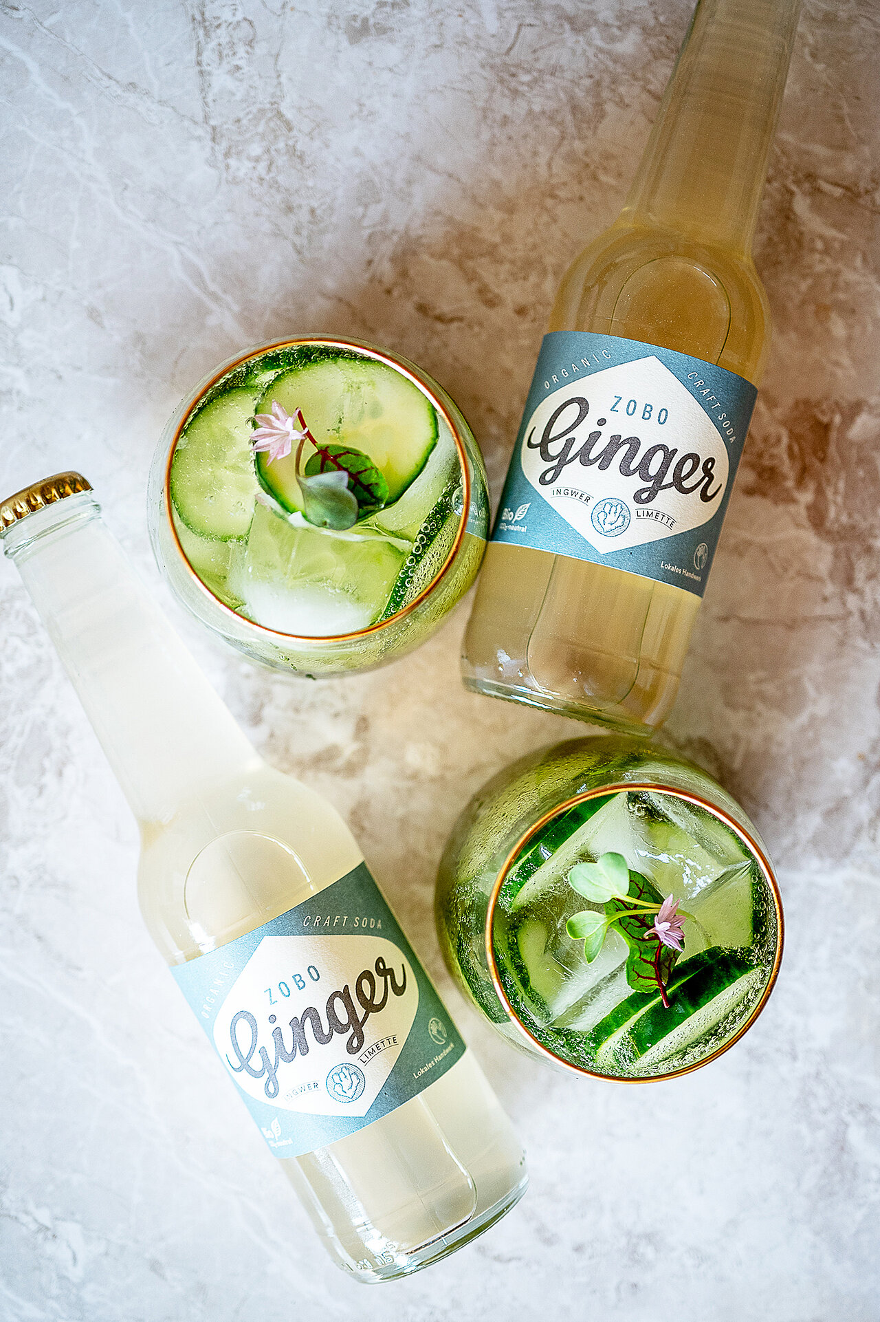 Eiswürfel und Gurkenscheiben in ein Glas füllen. Limettensaft darüber auspressen, Zobo-Ginger darübergiessen und das Ganze mit einer Limettenschale garnieren.