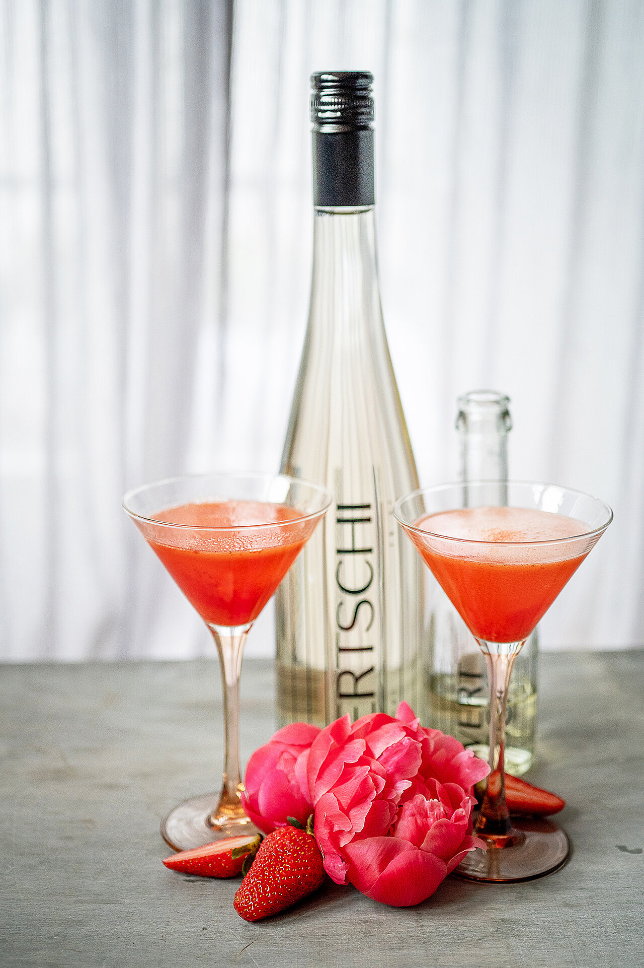 100 bis 150 g Frische Erdbeeren, eine halbe Biozitrone, 60 g Zucker, 350 ml Vertschi Weisswein, Eiswürfel