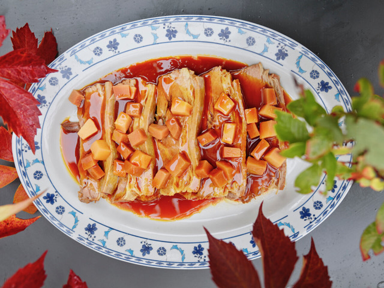Fleisch. Statt der Schulter kann man alternativ die Rindsbrust oder die Haxe verwenden. Es lohnt sich, das Fleisch bereits am Vortag zu schmoren und in der Sauce auskühlen zu lassen ‒ so bleibt es saftig, lässt sich einfach portionieren und später in der Sauce erwärmen. Je nach Saison kann man statt Quitten andere Früchte verwenden, im Sommer etwa Aprikosen.
