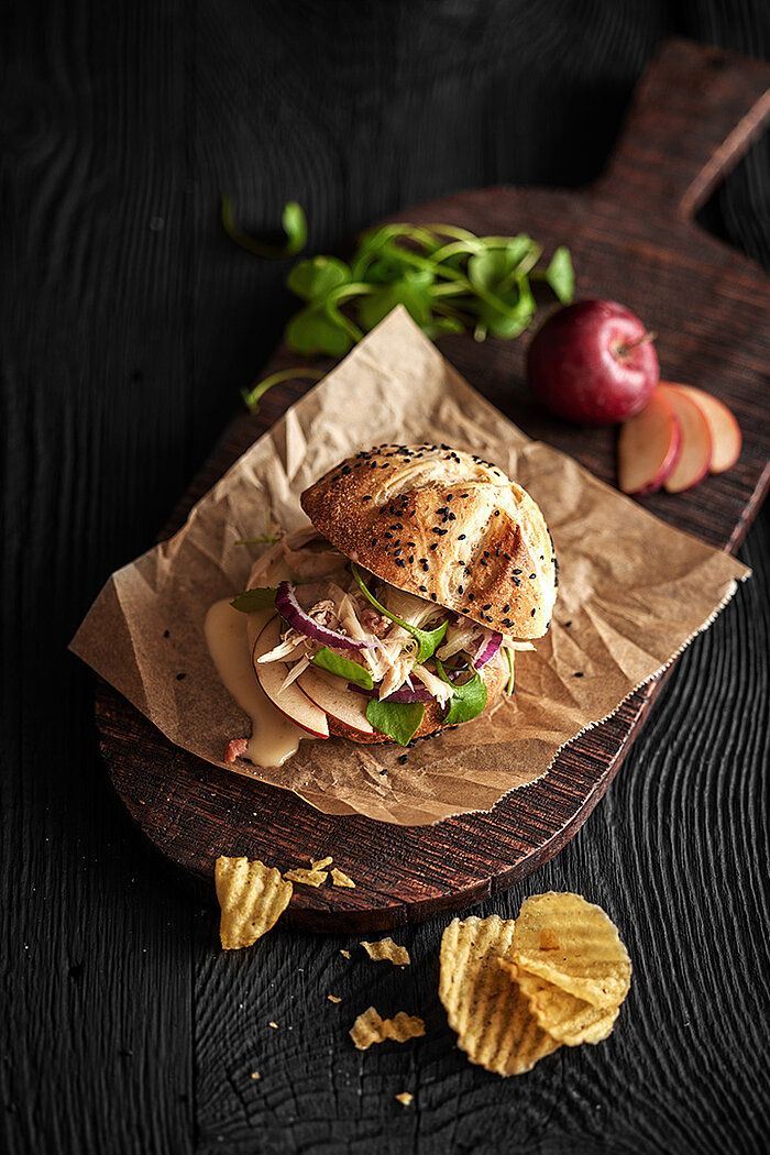 Gezupftes Fleisch vom Suppenhuhn, frischer Apfel, Portulak, rote Zwiebeln und Apfelweinsauce in einem hausgemachten Burgerbrötchen.