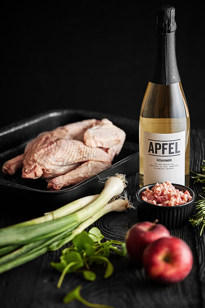 Eine Zwiebel klein hacken und zusammen mit dem Speck in etwas Butter in einem grossen, feuerfesten Topf andünsten. Das Suppenhuhn dazugeben und das Ganze mit 2 dl Gemüsefond und anschliessend mit Apfelwein ablöschen. Je nach Grösse des Topfes etwas mehr oder weniger Flüssigkeit beigeben. Das Ziel ist es, dass das Fleisch mindestens zu zwei Dritteln mit Flüssigkeit bedeckt ist. Das Ganze gut aufkochen und danach mindestens für eine Stunde zugedeckt weiterköcheln lassen. Dieser Prozess kann etwas verkürzt werden, wenn man die Legehenne zuerst nur im Gemüsefond im Dampfkochtopf einmal aufkocht. Danach sollte man sie aber unbedingt noch im Apfelwein garen lassen, weil erst dieser dem Ganzen seinen besonderen Geschmack verleiht.