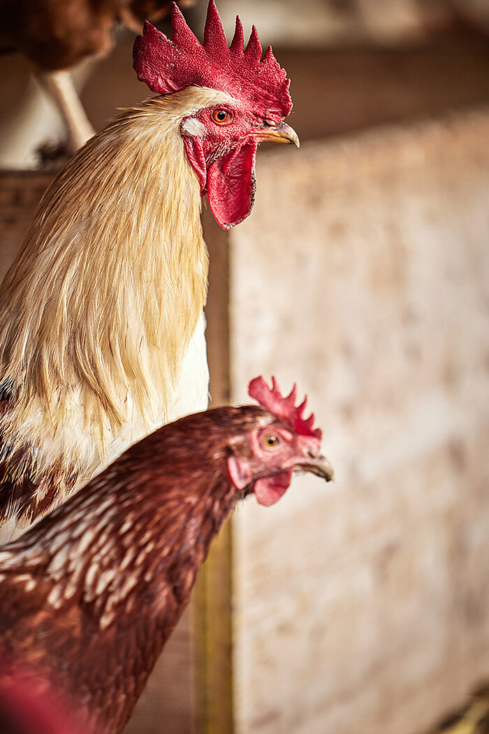 Im Stall haben die Hennen die Möglichkeit, zu scharren und auf Hindernisse zu springen.