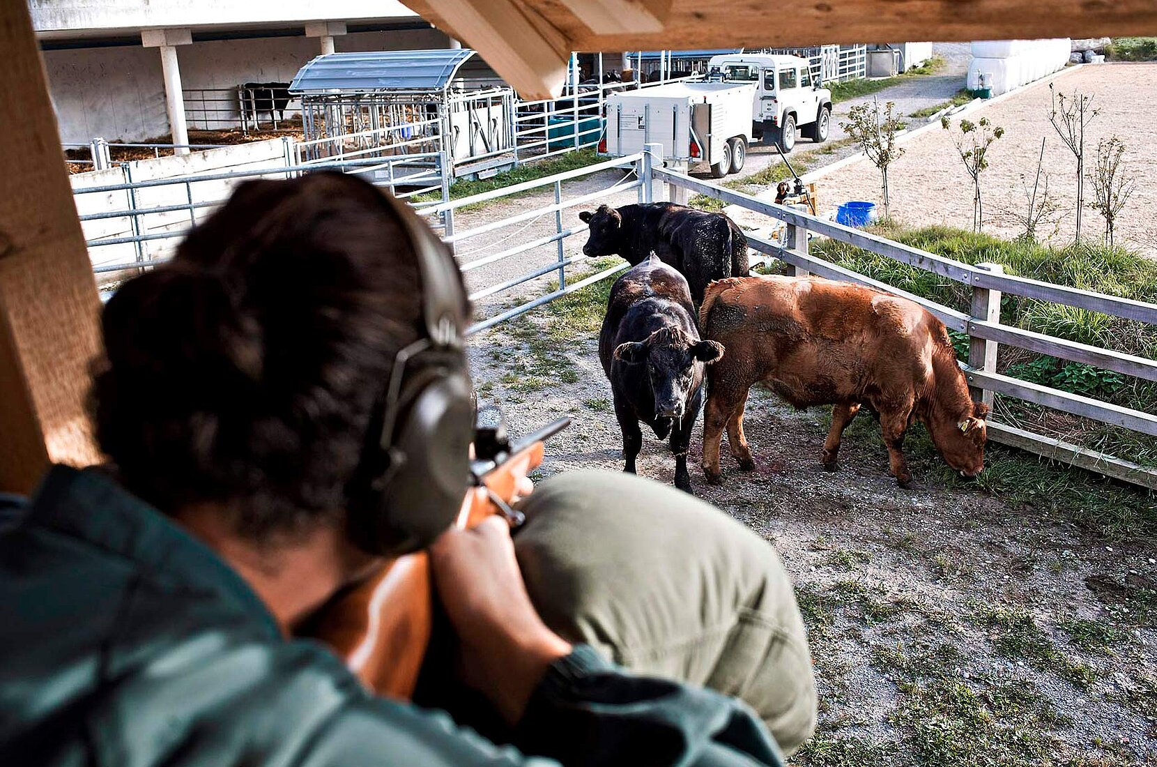 Wenn das Tier den Schuss zwischen die Augen bekommt, bricht es zusammen. Die Kühe und Kälber in der Herde schauen kurz auf. Dann wenden sie sich wieder dem Gras zu und weiden weiter.