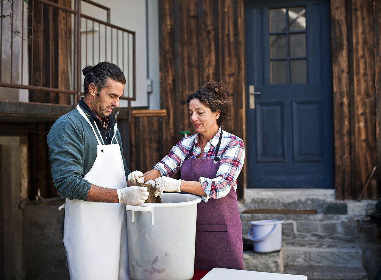 Claudia Wanger und Nils Müller beim Kuttelnputzen.